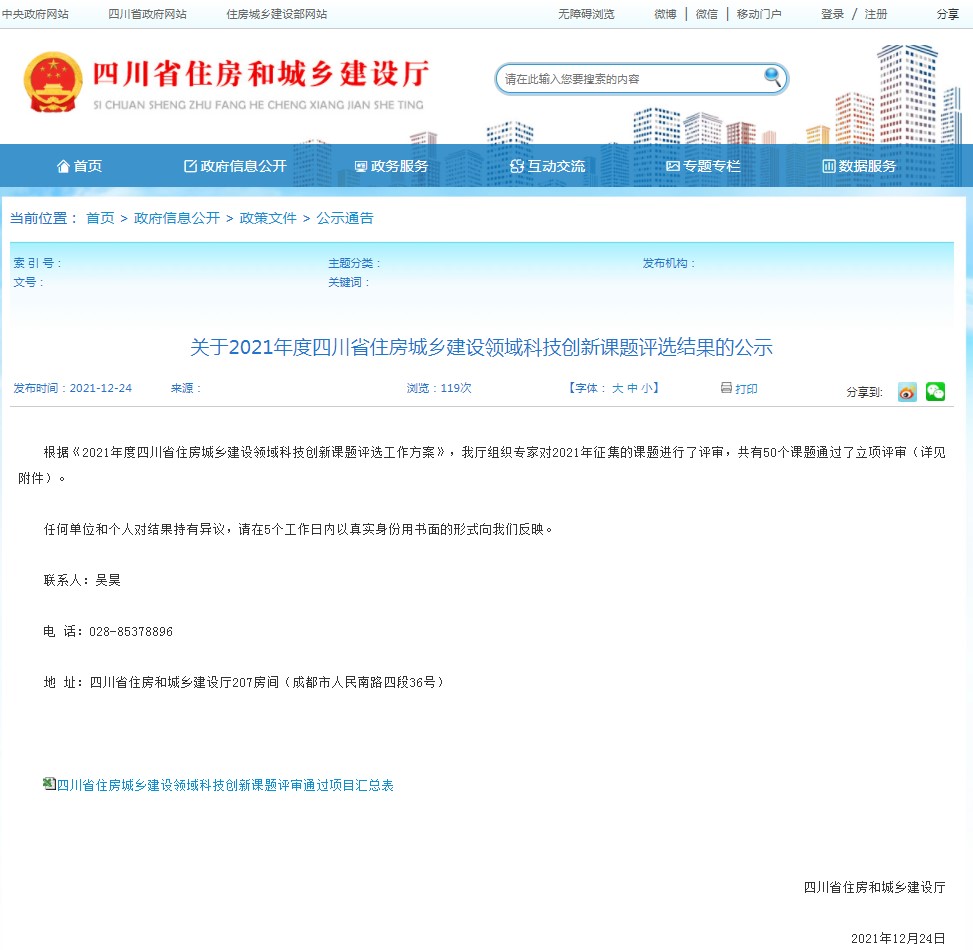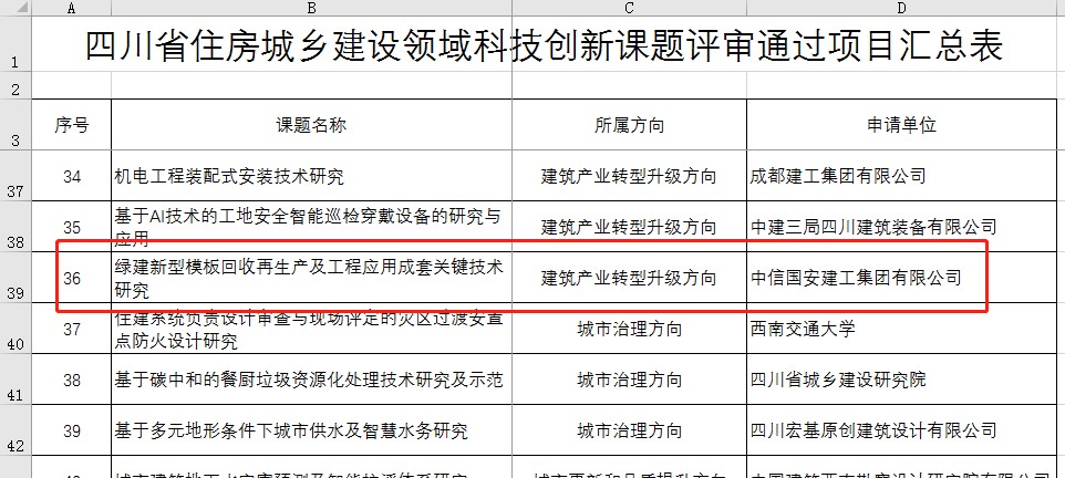 2021年12月24日,四川省住房和城乡建设厅官网发布了《关于2021年度四川省住房城乡建设领域科技创新课题评选结果的公示》的文件通知。根据《2021年度四川省住房城乡建设领域科技创新课题评选工作方案》,四川省住房和城乡建设厅组织专家对2021年征集的课题进行了评审,共有50个课题通过了立项评审,其中中信国安建工集团有限公司申报的科研课题《绿建新型模板回收再生产及工程应用成套关键技术研究》位列其中。